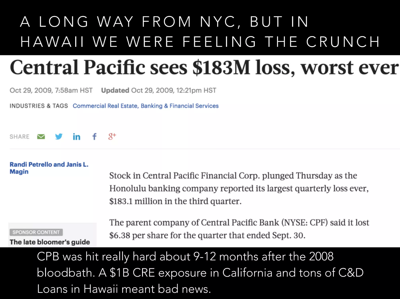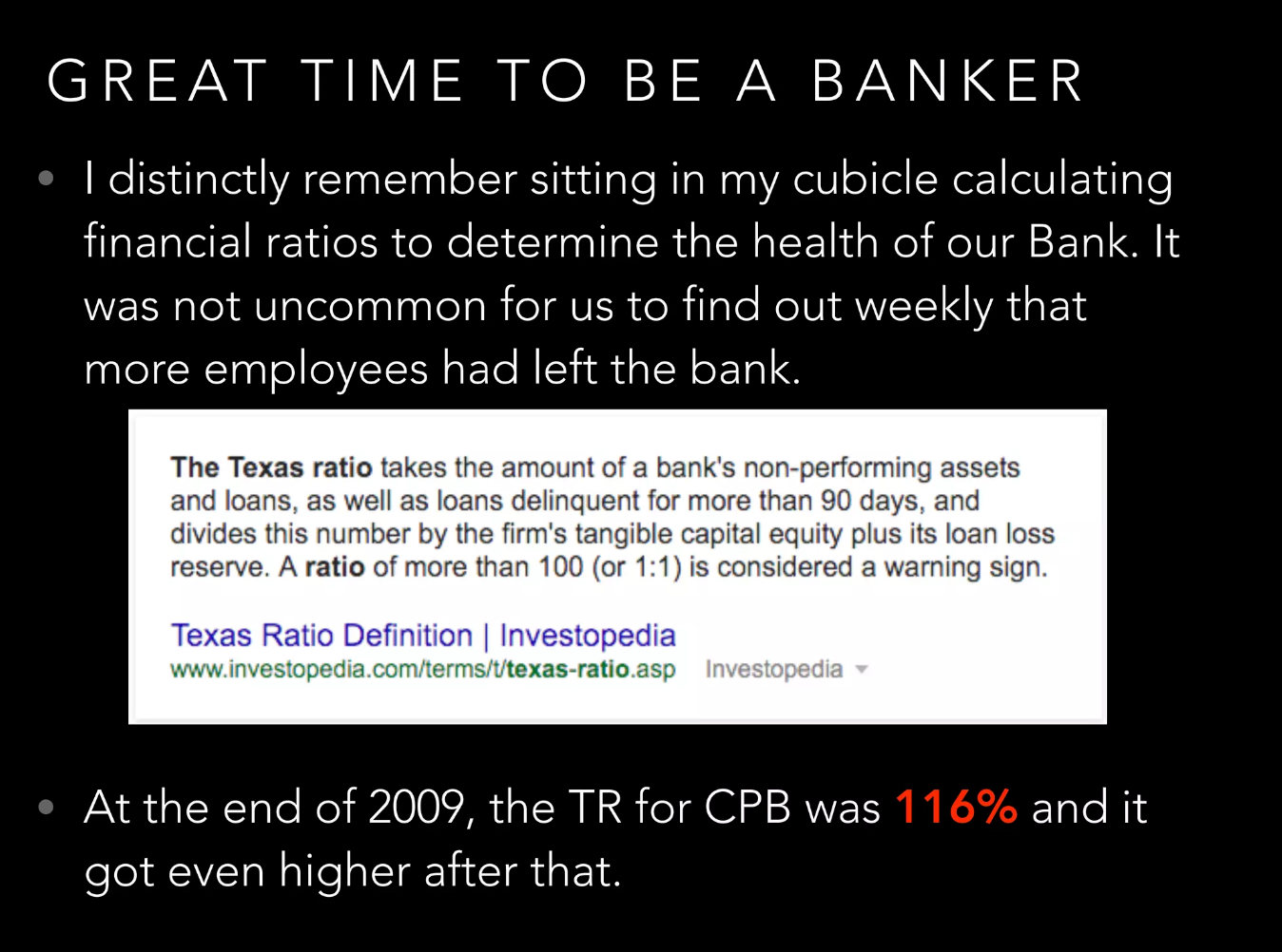 But man, I learned a TON. Especially in the 18-months I worked in our special assets division (where all the crappy loans get worked out and negotiated). Now that's the grind. That's where rubber meets the road. That's where some real old school bankers shined. And I was a passenger for it. Lucky me.