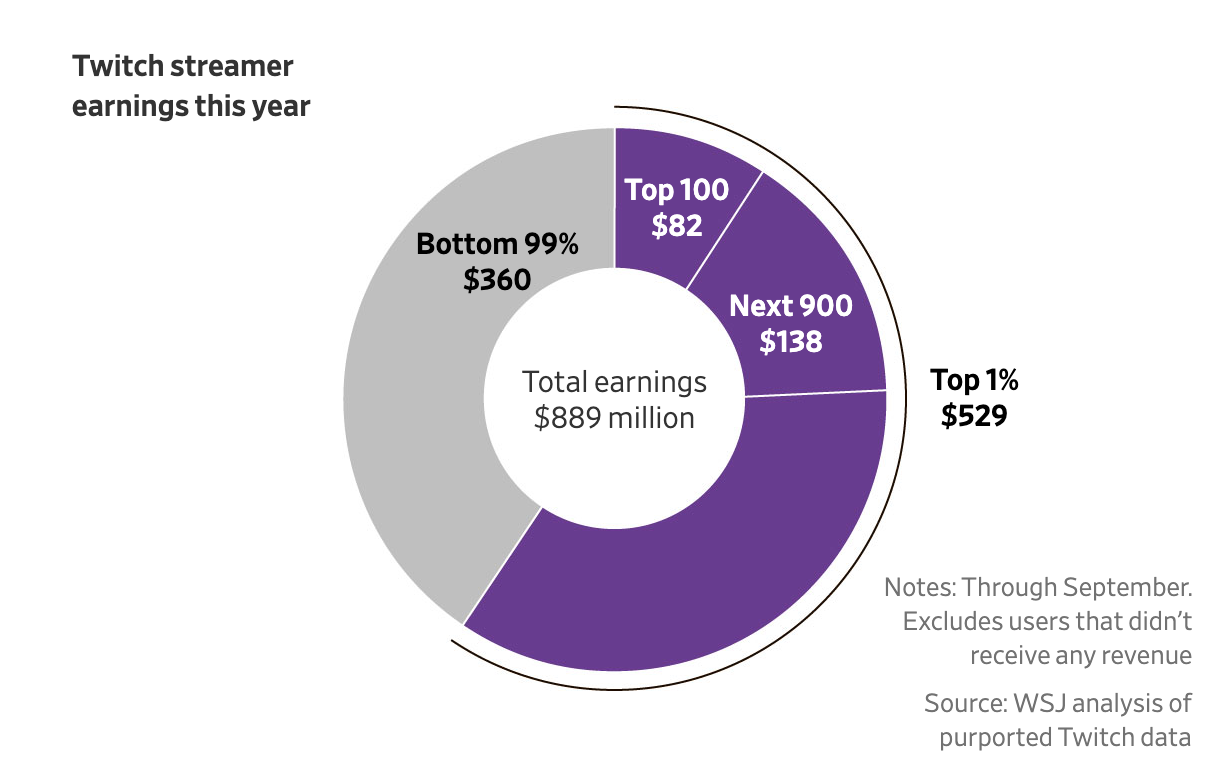 The top 1% of Twitch streamers made over half of the money in 2021 and only .06% percent made over the median household income of $67,521 per WSJ research from 2020.